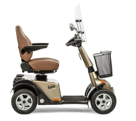 Met zijn opvallende uiterlijk is Solo Elegance de kers op de taart in de Life & Mobility scootmobiel productlijn: champagnekleurige kappen, ‘oak brown’ stoelbekleding met chique ruitpatroon, windscherm en verchroomde spiegels. Een tikkeltje stoer, een flinke dosis retro, maar vooral zeer elegant.